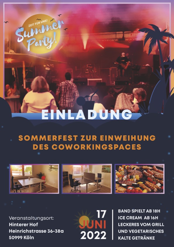 Am 17. Juni 2022 fand unserer Sommerfest in der Heinrichstrasse 36 in Köln Weiß statt. 100-120 Personen genoßen bei herrlichem Wetter eine erstklassige Liveband und das ausgezeichnete Essen unseres Caterers. Es muß nicht erwähnt werden, dass auch das ein oder andere Kaltgetränk an diesem Sommerabend getrunken wurde.